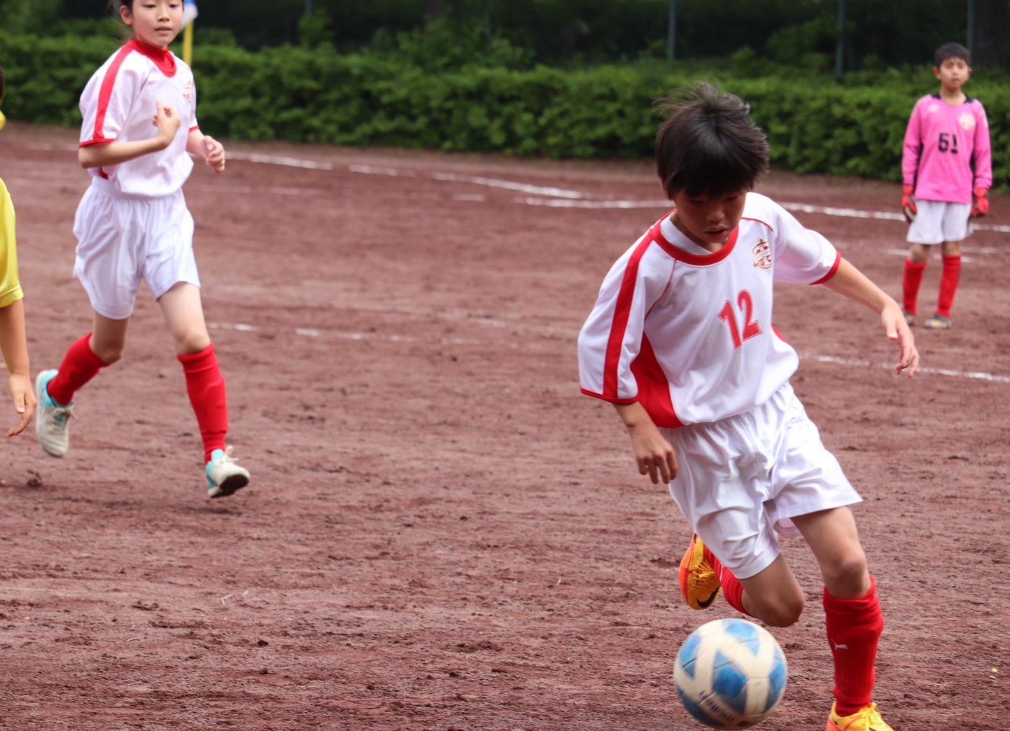 相手チームの方が走っています。パントキックや相手のクリアボール時は、相手選手よりも先に触ることを意識しましょう。